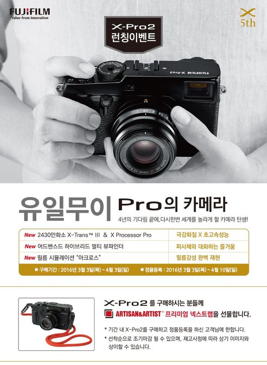 이번 X-Pro2 런칭 이벤트는 오는 4월 3일까지 약 한 달간 X-Pro2를 구매하고, 4월 10일까지 공식홈페이지를 통해 정품 등록한 소비자를 대상으로 한다. 참여자 전원에게는 20만 원 상당의 프리미엄 A&A(아티산&아티스트) 스트랩을 증정할 예정이다.