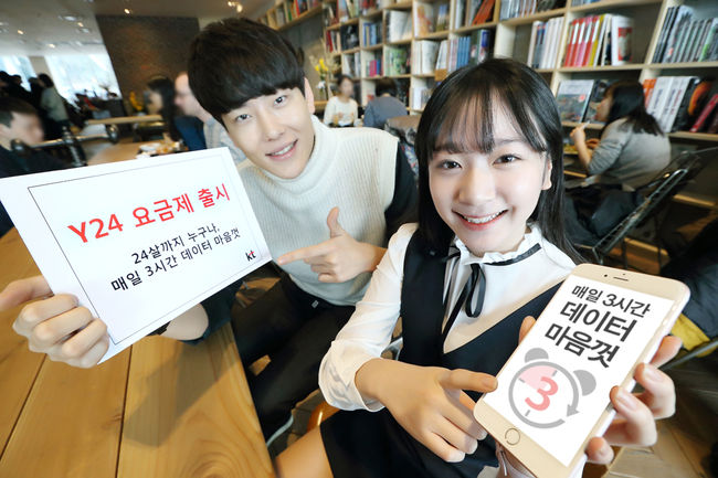 ‘Y24 요금제’ 이용자는 매월 기본 제공 데이터에 추가로 매일 연속 3시간 동안 데이터를 무제한으로 이용할 수 있다. 3시간 동안 2GB의 데이터가 기본 제공되며, 이후 최대 3Mbps의 속도로 무제한 이용 가능하다. (단, 599는 제외) 2GB의 데이터는 고화질 최신영화를 2~3시간 실시간 스트리밍으로 볼 수 있는 양이다.