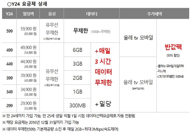 Y24 요금제 사용자는 ‘반값팩’을 통해 ▲‘올레 TV 모바일 데일리 팩’, ▲‘지니팩’, ▲‘LTE 데이터 500MB’ 서비스를 매월 50% 할인된 가격으로 이용할 수 있다. ▲ ‘올레 TV 모바일 데일리 팩’은 월 6000원에 매일 2GB의 올레 TV 모바일 전용 데이터를 제공하고, ▲‘지니팩’은 월 6000원에 음악 스트리밍 전용 데이터를 무제한 제공하며, ▲‘LTE 데이터충전 500MB’은 1회 충전시 8000원으로 반값팩 쿠폰을 활용해 각 50% 할인된 가격으로 이용할 수 있다.