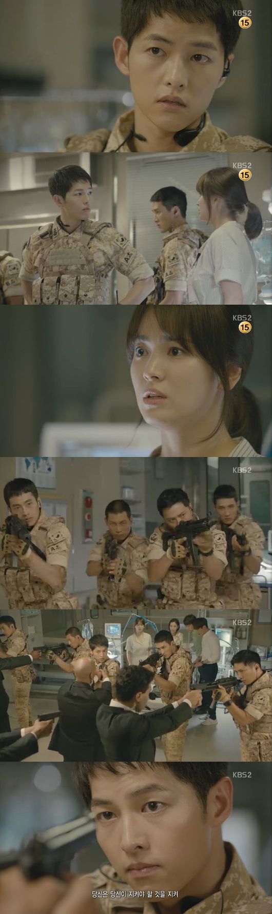 3일 오후 방송된 KBS 2TV 수목드라마 '태양의 후예'(극본 김은숙 김원석 연출 이응복 백상훈)에서는 환자를 살리려 하는 모연(송혜교 분)을 도와 아랍 VIP의 호위병들과 대치하는 시진(송중기 분)의 모습이 그려졌다.