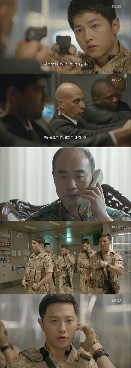 3일 오후 방송된 KBS 2TV 수목드라마 '태양의 후예'(극본 김은숙 김원석 연출 이응복 백상훈)에서는 아랍 VIP를 수술해 살리지 않을 경우 책임을 지게 될 모연(송혜교 분)을 위해 명령을 어기고 그를 돕는 시진(송중기 분)의 모습이 그려졌다.