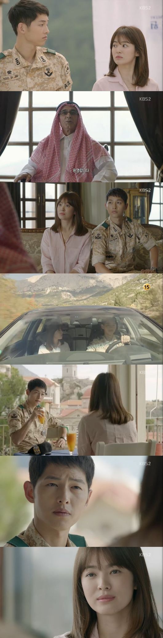 3일 오후 방송된 KBS 2TV 수목드라마 '태양의 후예'(극본 김은숙 김원석 연출 이응복 백상훈)에서는 아랍 의장의 수술을 해주고 난 후, 그로부터 생명의 은인으로 보답을 받은 시진(송중기 분)과 모연(송혜교 분)의 모습이 그려졌다.