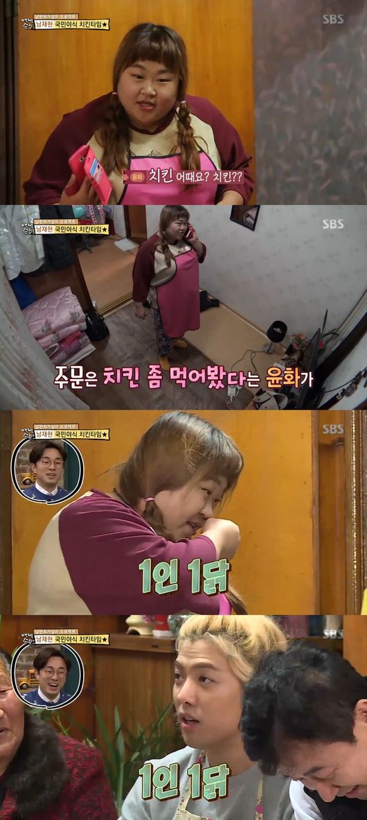 홍윤화는 3일 오후 방송된 SBS 예능프로그램 '자기야-백년손님(이하 '자기야')'에서 야식으로 즉석에서 치킨을 배달시켰다.