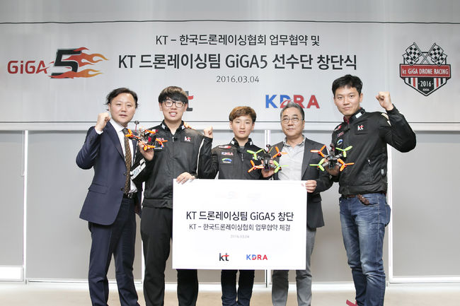 KT는 이날 KT 광화문빌딩 EAST에서 드론레이싱팀 ‘GiGA5’의 창단식을 가졌다. ‘GiGA5’는 드론의 빠른 속도를 KT의 GiGA 서비스와 연계하여 표현하고, 기가급 기량을 보유한 5명의 정예로 구성된 선수단을 의미한 명칭이다.