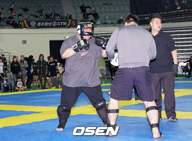 그리고 특별한 시간도 생겼다. 선수들이 잠시 휴식시간을 갖는 동안 격투기를 취재하고 있는 기자들과 로드FC 현역 선수들과의 친선 경기가 열렸다.