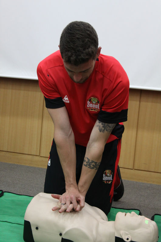 교육내용은 그라운드에서 발생할 수 있는 심정지 및 기도폐쇄에 대한 응급처지요령을 습득한 뒤, AED(자동제세동기) 사용법을 직접 실습하며 그라운드 위의 안전문화정착을 위한 뜻 깊은 시간을 가졌다.