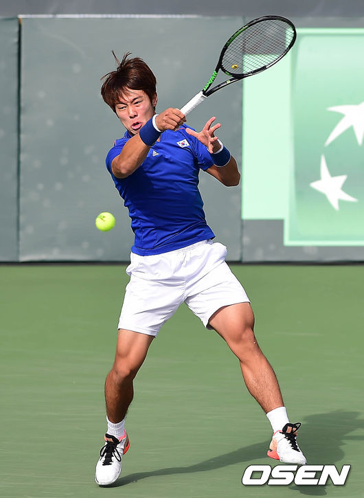 6일 오전 서울 송파구 방이동 올림픽공원 테니스장에서 열린 2016 데이비스컵 아시아-오세아니아 지역 그룹예선 한국과 뉴질랜드의 복식 경기, 이덕희가 리턴을 하고 있다.