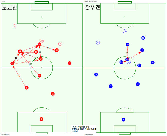 지난달 23일 열린 FC 도쿄(일본)와 AFC 챔피언스리그 조별리그 1차전과 비교가 될 수밖에 없다. 전북은 당시 2선은 물론 3선 에릭 파탈루까지 가세해 다양한 루트로 공격을 시도했다. 당시 왼쪽 측면에 나선 고무열에게 몰리는 패스가 많은 편이었지만, 다른 선수들에게도 비슷한 비율의 패스가 시도됐다. 도쿄는 한 선수만 대비해서는 전북의 공격을 막을 수가 없었다.