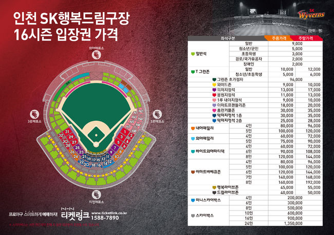 SK와이번스(대표이사 류준열)가 2016시즌 홈경기 입장권 가격을 확정, 발표했다.