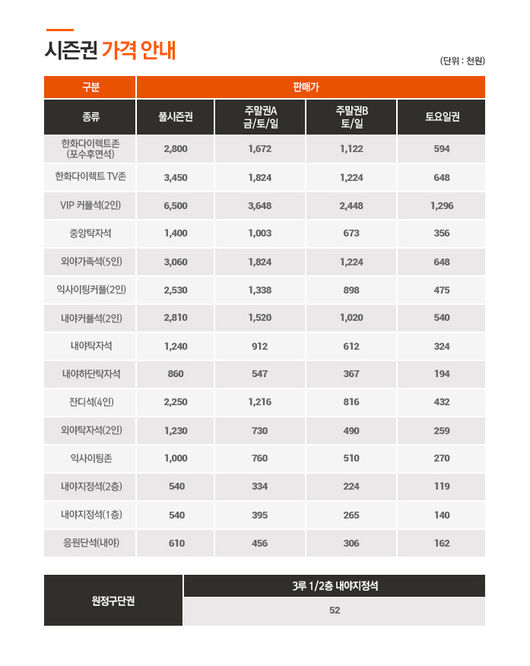 2016년 시즌권(총 72경기)은 각 좌석별 풀시즌권, 주말권A(38경기), 주말권B (24경기), 토요일권(12경기), 원정구단권(구단별 8경기)등 다양한 형태로 구성 되어있다.