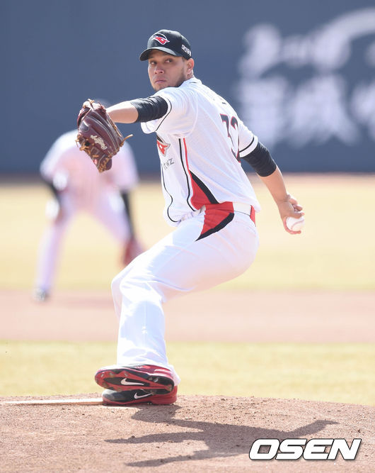 1회초 무사에서 kt 선발 투수 피노가 힘차게 공을 던지고 있다.