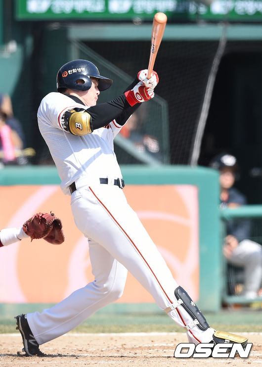 2회말 무사 1,2루 한화 이성열이 1타점 적시타를 때리고 있다.