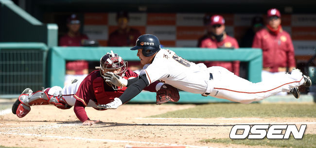 4회말 무사 1루 한화 주현상이 이성열의 안타때 홈으로 쇄도하다 아웃당하고 있다.