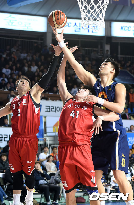 하승진(전주 KCC)의 존재감은 한 명의 선수 이상의 것이었다. 안양 KGC가 주눅 드는 것도 무리가 아니었다.