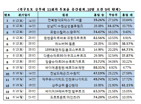 체육진흥투표권 스포츠토토의 수탁사업자인 케이토토(www.ktoto.co.kr)가 오는 12일(토)부터 14일(월)까지 벌어지는 K리그 클래식 6경기와 독일 분데스리가 8경기 등 총 14경기를 대상으로 한 축구토토 승무패 11회차를 발행한다.