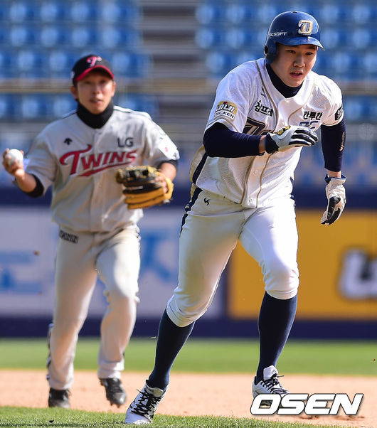 10일 오후 경남 창원시 마산야구장에서 열린 '2016 타이어뱅크 KBO 리그' NC 다이노스와 LG 트윈스의 시범경기 4회말 무사 1루 나성범 타석, 런다운에 걸린 1루주자 박민우가 귀루를 시도하고 있다.