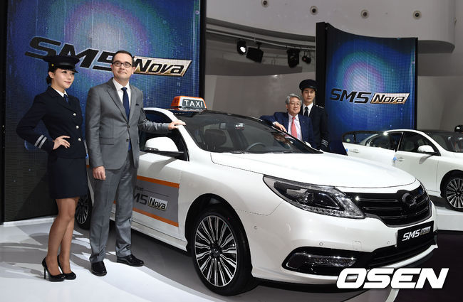 [사진] 2015년 1월 SM5 노바 출시 당시 차를 사이에 두고 포즈를 취하고 있는 프랑수아 프로보 사장(왼쪽)과 박동훈 부사장.
