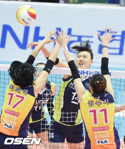 현대건설은 11일 수원실내체육관에서 열린 ‘2015-2016 NH농협 V-리그’ 여자부 흥국생명과의 플레이오프 1차전에서 선수들의 고른 활약 속에 세트스코어 3-1 역전승을 거뒀다. 현대건설은 듀스 접전 끝에 1세트를 내줬다. 그러나 뒷심을 발휘하며 경기를 뒤집었다. 양효진은 전날 허리 염좌 부상을 입었지만 끝까지 공격을 이끌었다.