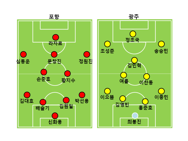 포항은 파상공세를 벌인 끝에 극적인 동점골까지 만들었다. 후반 45분 심동운이 강력한 오른발 슈팅으로 광주의 골네트를 다시 한 번 갈랐다. 포항은 후반 추가시간 라자르의 크로스를 받은 황지수의 역전골로 극적인 승부를 만드는 듯했다. 끝이 아니었다. 포항은 종료 직전 김대호가 페널티킥을 내줬다. 광주는 김정현이 깔끔하게 성공시키며 무승부를 만들었다.