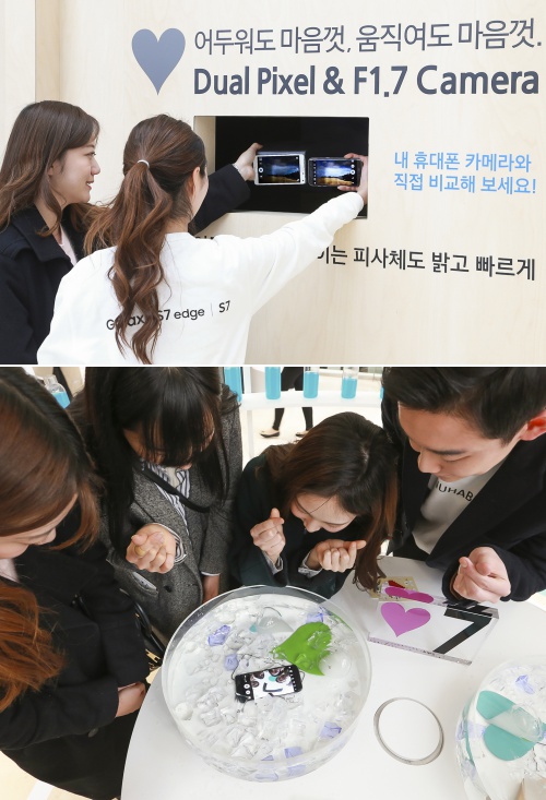 ‘카메라 체험존’에서는 듀얼 픽셀 이미지 센서와 F1.7 렌즈를 탑재해 어두운 환경에서도 사진이 찍히는 성능을 확인할 수 있다. ‘방수 체험존’은 ‘갤럭시 S7’을 물 속에 넣은 채 셀피 사진을 찍어 볼 수 있다.