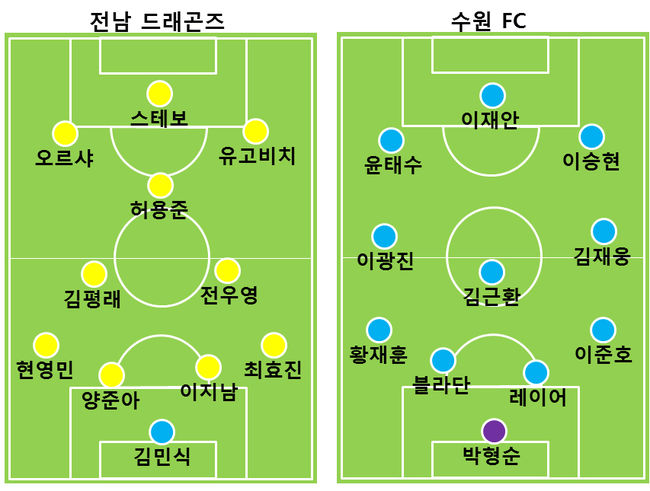 전남은 예상과 큰 차이가 없는 선발 명단을 들고 나왔다. 특히 전남의 강점으로 평가받는 공격진에 스테보를 최전방에 배치하고 오르샤와 유고비치를 좌우 측면, 공격형 미드필더에 신인 허용준을 투입했다.