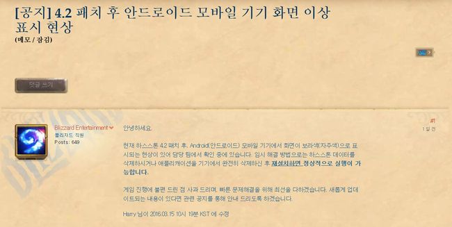 하스스톤 공식 홈페이지에 곧바로 해당 오류와 관련한 공지사항이 올라왔다. 블리자드 관계자의 게시글에 따르면 화면 이상 현상에 대한 구체적인 원인과 해결 방안은 아직 확인되지 않았다. 임시 해결 방법으로는 하스스톤 데이터를 삭제하거나 하스스톤 앱을 완전 삭제 후 재설치하면 원활한 실행이 가능하다고 전했다.