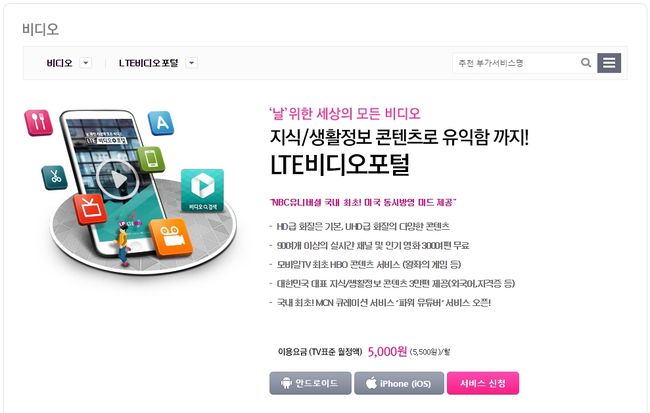 LTE비디오포털은 지난해 7월 모바일 세계 최초로 출시됐다. TV, 영화를 비롯해 외국어, 다큐멘터리, 인문학 특강 등 지식, 생활정보 콘텐츠 5만편 등 총 17만여편의 콘텐츠를 제공하고 있다.