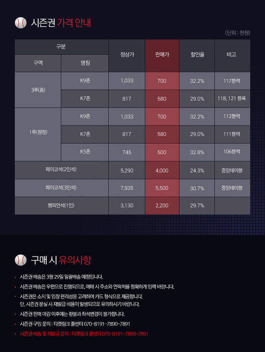 KIA는 이번 시즌티켓을 정상가 대비 24.3~32.8% 할인해 판매한다. 중앙테이블 2인석은 4백만원, 3인석은 5백50만원에 각각 판매한다. 올 시즌 메이저리그식 프리미엄 의자로 교체한 챔피언석은 1인 기준 2백20만원이다. 내야지정석인 K9존은 70만원으로 책정됐고, K7존은 58만원, K5존은 50만원에 각각 판매한다.