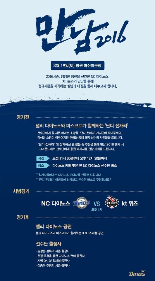 NC 다이노스가 2016시즌 힘찬 행진을 시작한다. NC는 오는 19일 kt wiz와의 창원 마산구장 홈 경기에서 ‘만남 2016’ 행사를 열고 팬들과 함께 행진을 시작한다.