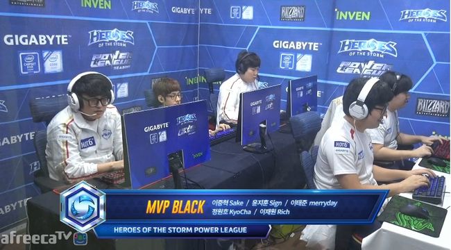 MVP 블랙이 17일 서울 강남구 선릉 인벤 스튜디오에서 열린 ‘기가바이트 히어로즈 오브 더 스톰 파워리그(이하 히어로즈 파워리그)’ 시즌1 4강 승자조 히어로와 경기서 깔끔하게 3-0 완승을 거두고 결승에 직행했다.
