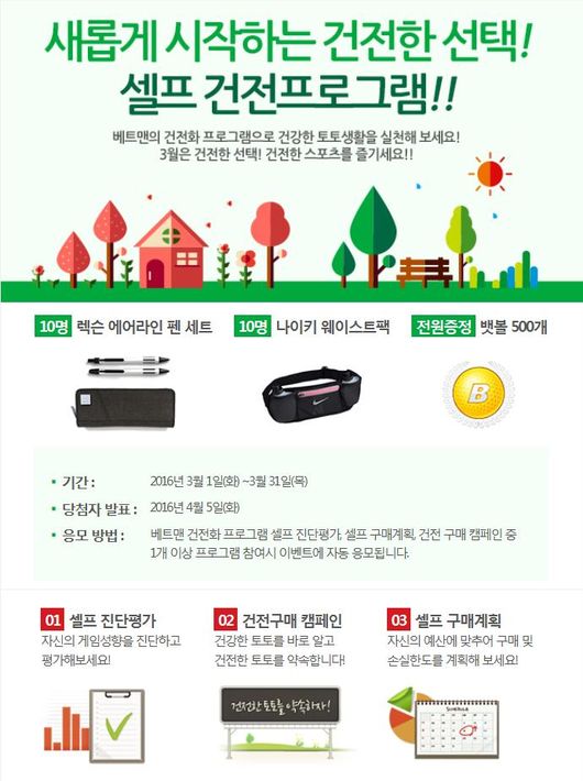 체육진흥투표권 스포츠토토의 공식온라인 발매사이트 베트맨(www.betman.co.kr)의 3월 이벤트 ‘새롭게 시작하는 건전한 선택, 셀프 건전프로그램’ 이벤트가 성황리에 진행되고 있다.