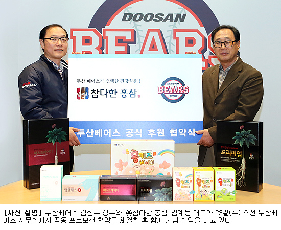 두산 베어스가 23일 오전 10시 잠실야구장 사무실에서 '㈜참다한 홍삼(www.chamdahan.com)'과 공동 프로모션 협약식을 체결했다.