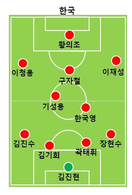 포백라인은 왼쪽부터 김진수(호펜하임), 곽태휘(알 힐랄), 김기희(상하이 선화), 장현수(광저우 푸리)가 형성했다. 골키퍼 장갑은 부상 복귀한 김진현(세레소 오사카)이 꼈다.