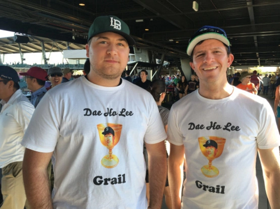 메이저리그 공식 홈페이지(MLB.com)의 매리너스 블로그는 25일(이하 한국시간) 경기장을 찾은 특이한 팬을 소개했다. 이대호의 팬이 됐다는 미국인 2명이었다. 매리너스 블로그는 “경기(25일 콜로라도)가 끝난 이후 매리너스의 신입생 이대호를 응원하는 티셔츠를 입은 2명의 젊은 남성이 눈에 띄었다”라고 소개했다.