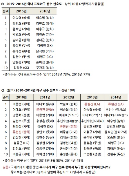 한편 좋아하는 KBO리그 선수가 '없다'는 응답은 지난해 73%에서 올해 77%로 소폭 늘었다. 평소 프로야구 관심층(414명) 중에서도 53%는 특별히 좋아하는 선수가 없다고 답했고, 비관심층(560명)에서는 그 비율이 94%에 달했다. 류현진·강정호에 이어 박병호·김현수까지 국내 스타선수들의 해외 진출이 활발하게 이뤄지면서 비롯된 현상이라는 분석이다.