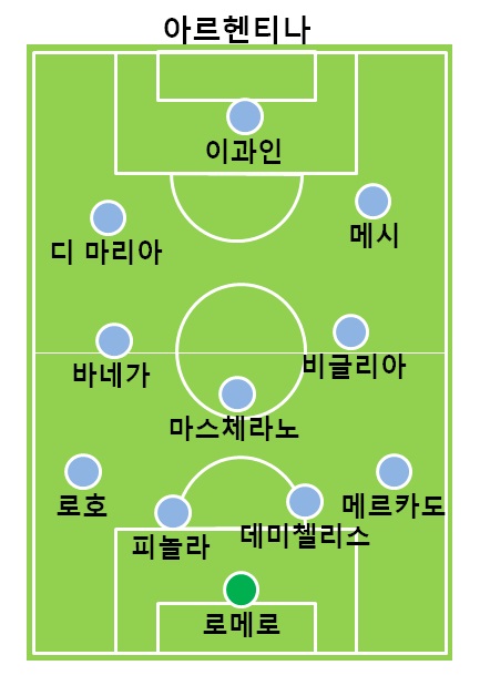 아르헨티나는 4-3-3 전형을 내세웠다. 최전방의 곤살로 이과인을 필두로 좌우 측면에서 앙헬 디 마리아와 리오넬 메시가 지원사격했다. 중원은 에베르 바네가, 하비에르 마스체라노, 루카스 비글리아가 구축했다. 포백 라인은 좌측부터 마르코스 로호, 마르틴 데미첼리스, 하비에르 피놀라, 가브리엘 메르카도가 형성했다. 골키퍼 장갑은 세르히오 로메로가 꼈다.