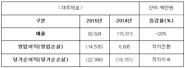 네시삼십삼분(이하 4:33)은 31일 보도자료를 통해 지난 2015년 매출 926억, 영업손실 145억을 기록했다고 밝혔다.