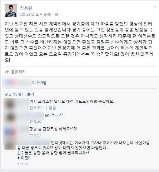 사태가 커지자 김동진은 자신의 SNS에 직접 글을 올렸다. 김동진은 “지난 일요일 치른 시즌 개막전에서 경기 중에 제가 파울을 당했던 영상이 인터넷에 돌고 있는 것을 알게 됐습니다. 경기 중에는 그런 상황들이 종종 발생할 수 있고 상대선수도 의도적으로 그런 것은 아니라고 생각하기 때문에 팬 여러분들도 너무 그 선수를 비난하지는 않았으면 좋겠고 김정훈 선수에게도 상처가 되지 않았으면 좋겠어요. 지난 홈경기에 더 좋은 결과를 냈어야 하는데 개인적으로도 많이 아쉽고 오는 토요일 홈경기에서는 꼭 승리할게요! 많이 응원 와주세요!”라며 오히려 상대선수를 배려했다.