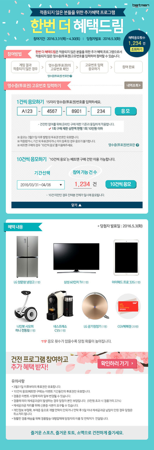 응모 방법은 베트맨 이벤트 코너를 방문한 후, 31일 이후부터 4월 30일까지 구매한 투표권 중 적중되지 않은 투표권의 15자리 고유번호를 입력하면 된다. 베트맨을 통해 투표권을 구매한 고객이라면 ‘10건씩 응모하기’를 통해 손쉬운 응모가 가능하며, 이벤트 참여시 추첨을 통해 LG 양문형 냉장고(1명), 삼성 60인치 TV(1명), 아이패드 Pro 32G(1명), 미니 전동휠(1명), 네스프레소 C55(1명), LG공기청정기(1명), 영화 예매권(1인 2매, 20명) 등 다양한 경품을 지급한다. 단, 적중된 투표권이나 이벤트 기간 외에 발행된 투표권일 경우 응모가 불가하다.