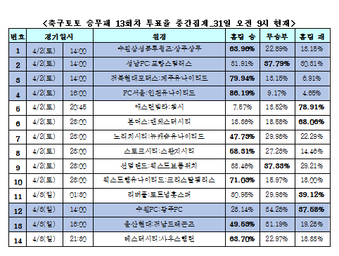 체육진흥투표권 스포츠토토의 수탁사업자인 케이토토(www.ktoto.co.kr)가 오는 4월 2일(토)부터 3일(일)까지 벌어지는 K리그 클래식 6경기와 잉글랜드 프리미어리그 8경기 등 총 14경기를 대상으로 한 축구토토 승무패 13회차를 발행한다.