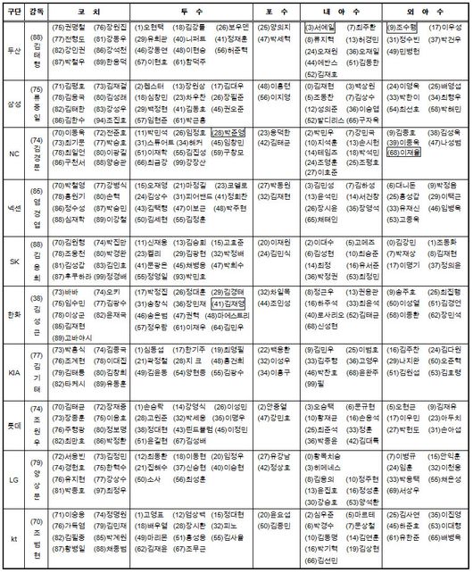 포지션별로는 투수가 106명으로 가장 많아 전체 인원의 39.7%를 차지했으며, 내야수 80명(30%), 외야수 60명(22.4%), 포수가 21명(7.9%)이다. 2016시즌 신인선수(표 안 네모 표시)는 투수, 외야수 각 2명, 내야수 1명 등 총 5명의 선수가 이름을 올렸으며, 외국인 선수도 24명이 포함되었다.