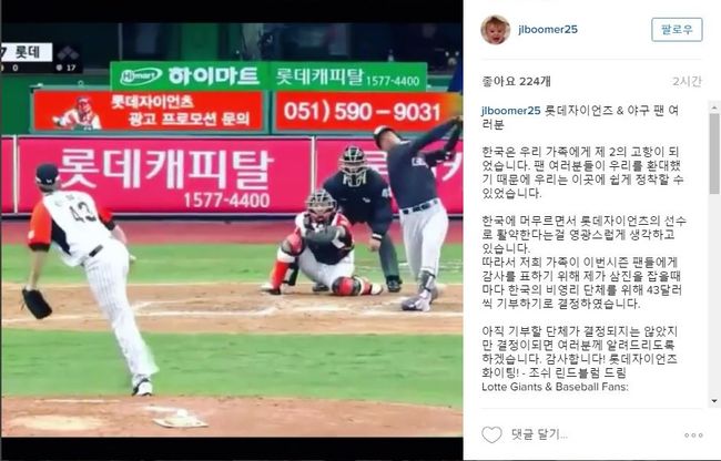 마지막으로 “아직 기부할 단체가 결정되지는 않았지만 결정이되면 여러분께 알려드리도록 하겠습니다. 감사합니다! 롯데자이언츠 화이팅! - 조쉬 린드블럼 드림”으로 글을 끝맺었다.