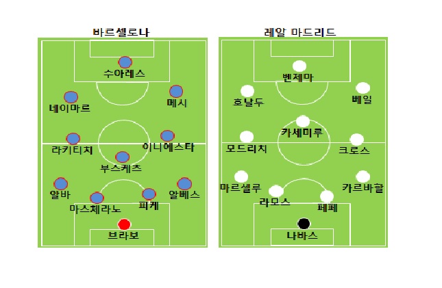바르셀로나는 끊임없이 공격을 펼쳤다. 호날두도 수비게 가담한 모습. 레알 마드리드는 베일의 빠른 스피드를 통해 반전을 노렸지만 쉽게 연결되지 않았다.