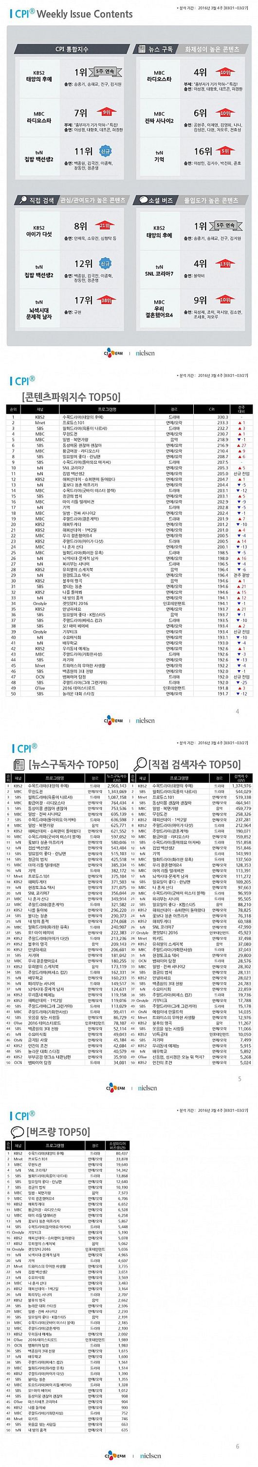 4일 CJ E&M과 닐슨코리아가 발표한 3월 넷째 주(3.21~3.27) 콘텐츠파워지수 조사결과에 따르면 ‘태양의 후예’가 330.3으로 1위를 굳혔다. 2위는 Mnet 예능 '프로듀스101'이 222.3, 3위는 SBS 드라마 '육룡이 나르샤'가 232.7, 4위는 MBC 예능 ‘무한도전’이 230.7, 5위는 MBC 예능 ‘복면가왕’이 218.9를 각각 나타냈다.