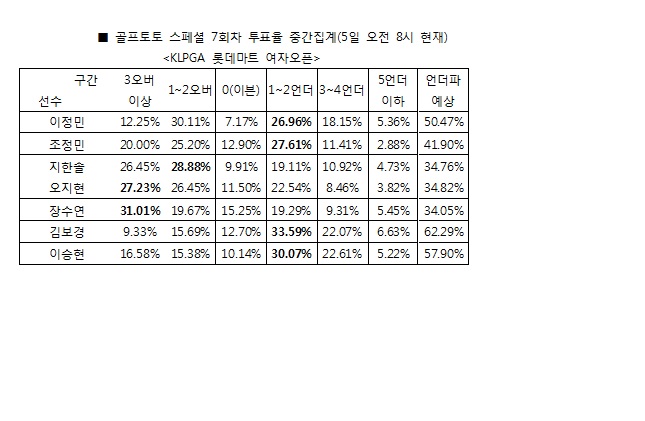 또, 이승현(57.90%), 이정민(50.47%)이 과반수의 언더파 투표율을 넘으며 1라운드에서 준수한 활약을 할 것으로 예측됐다. 이밖에 2번 조정민(41.90%), 4번 오지현(34.82%), 3번 지한솔(34.76%), 5번 장수연(34.05%)은 상대적으로 언더파 확률이 낮은 것으로 집계됐다.