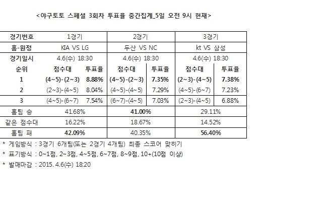 한편, 주중에 벌어지는 국내프로야구 3경기를 대상으로 하는 야구토토 스페셜 3회차 게임은 오는 6일 오후 6시 20분에 발매가 마감되며, 경기가 모두 종료된 후에 적중결과가 공식 발표된다.
