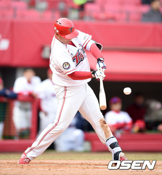 KIA 기대주 김주형이 시즌 마수걸이 홈런포를 날렸다.