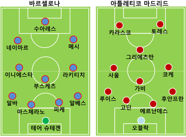 아틀레티코 마드리드의 수비에 바르셀로나는 고전했다. 좀처럼 박스 안으로 파고 들어 슈팅을 시도하지 못했다. 박스 밖에서 나오는 슈팅이 대부분이었다.