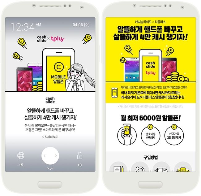 또 캐시슬라이드는 알뜰폰 쇼핑몰에서 티플러스 번호이동 신청 시 4만캐시, 신규가입 신청 시 2만 5000캐시를 적립해주는 혜택을 제공한다. 선착순 100명에게는 1만 캐시를 추가로 제공하는 신규제휴기념 이벤트도 실시해 사용자에게 최대 5만 캐시 혜택을 돌려줄 예정이다.