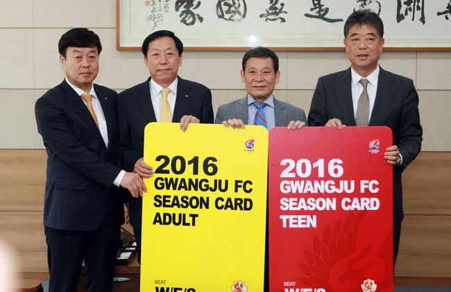 광주는 8일 오전 11시 광주광역시청 접견실에서 윤장현 광주광역시장, 기영옥 광주FC 단장, 박재균 KB국민은행 광주전남지역영업그룹 대표, 정회안 광주동부지역본부장 등이 참석한 가운데 광주FC 시즌권 구매-전달식을 가졌다.